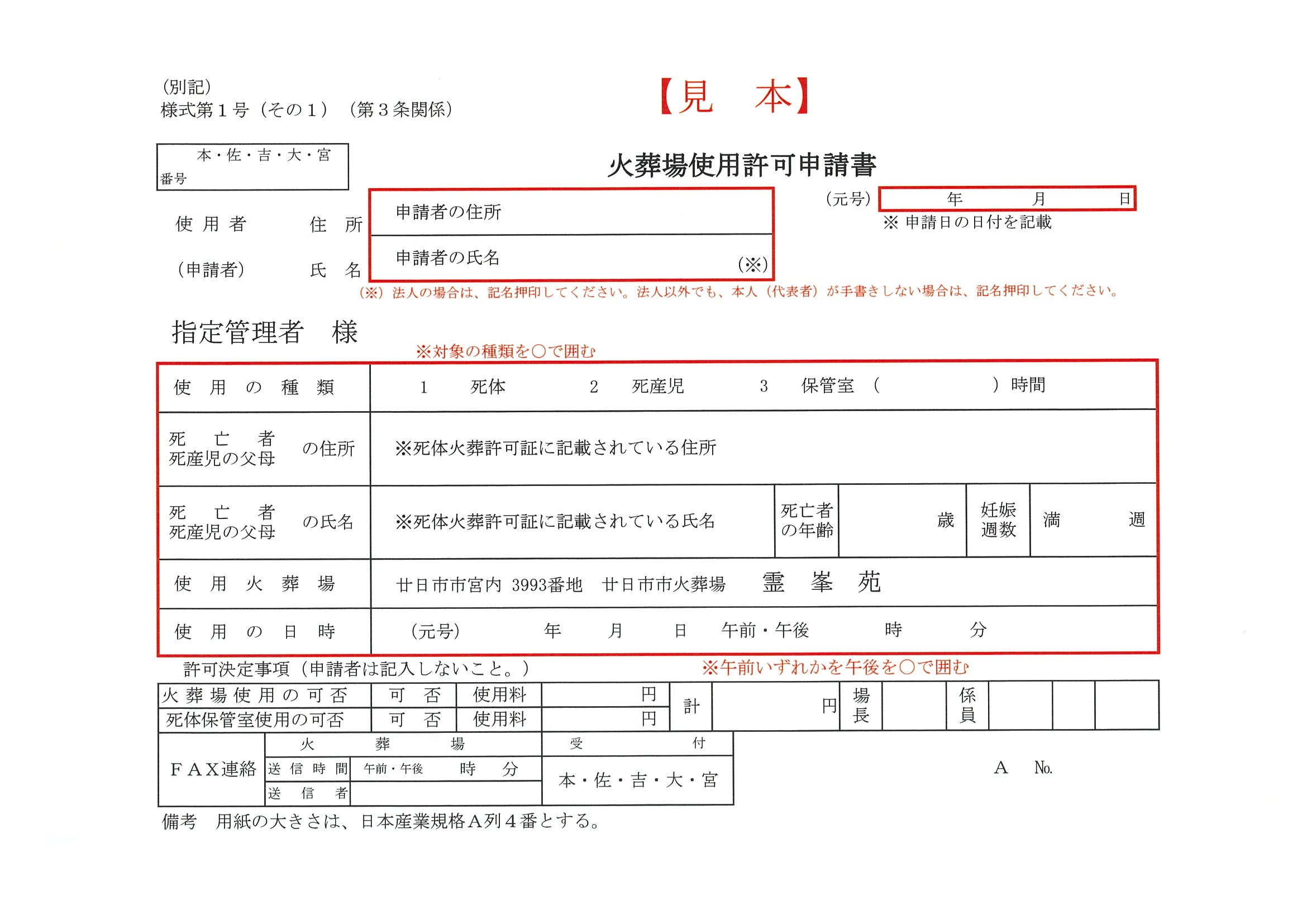 火葬場を使用される際は、以下の様式をダウンロードして必要事項をご記入の上、廿日市市火葬場霊峯苑窓口にお越しください。